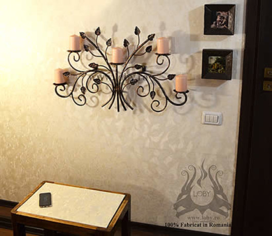 Suport pentru lumanarii din fier forjat, un obiect decorativ pentru perete, un cadou perfect pentru orice ocazie, lumanarile nu sunt incluse. Executat din fier forjat, produs 100% fabricat in Romania, este alegerea perfecta pentru a va decora casa .
